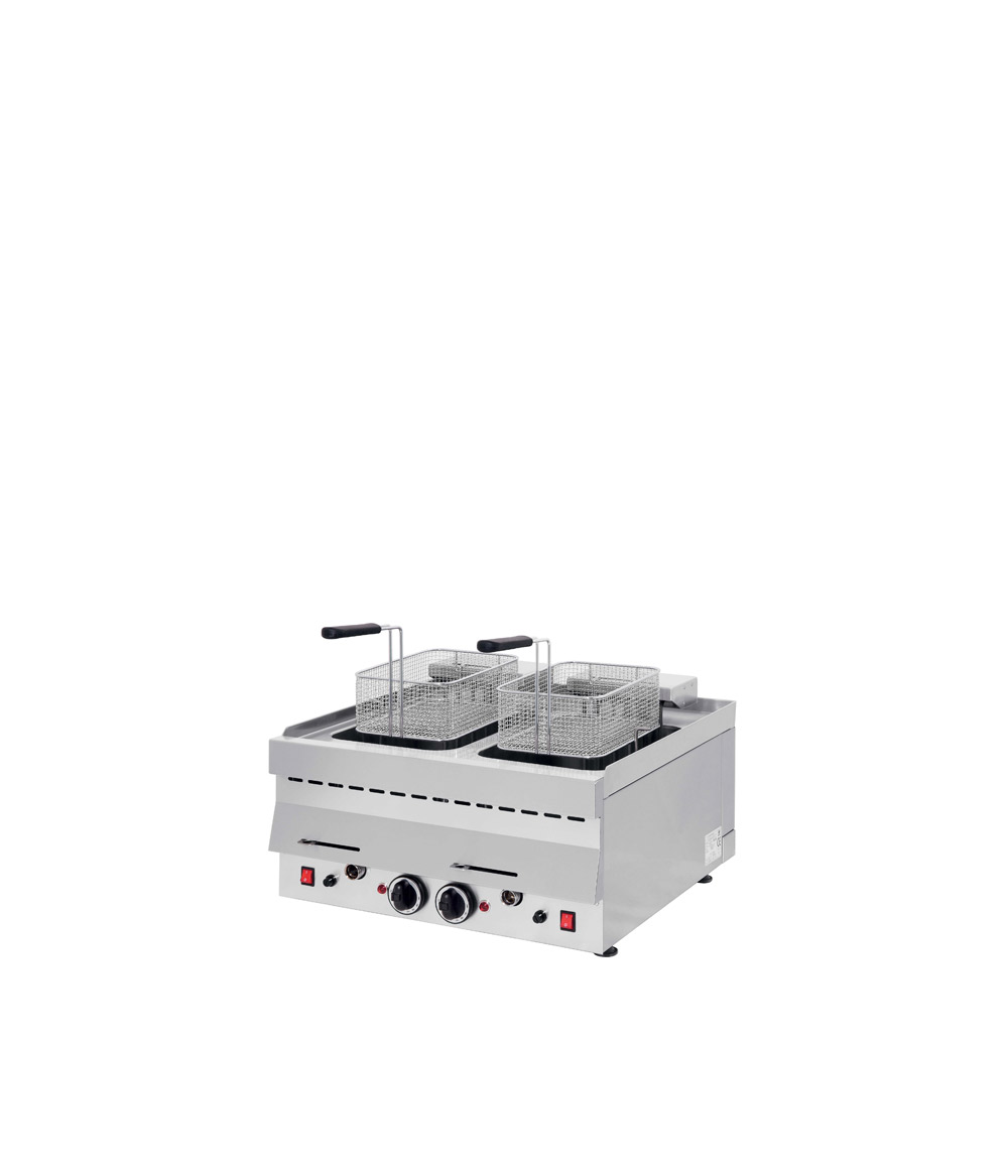 Η Φριτέζα Ηλεκτρική Διπλή 8-10 lt – FL62 είναι κατασκευή του Ελληνικού εργοστασίου North Pro Gas, και έχει δύο κάδους χωρητικότητας 8-10 lt. Διαθέτει 2 καλάθια 28 x 20 x 11 cm και κάνουλα για την αποστράγγιση κάθε κάδου. Σας δίνει την δυνατότητα να τηγανίζετε διάφορα προϊόντα γρήγορα με σταθερή ποιότητα & χαμηλή κατανάλωση. Η θερμοκρασία της επιτραπέζιας διπλής ηλεκτρικής φριτέζας ελέγχεται από θερμοστάτη από 50°C έως 190°C. Ο θερμοστάτης είναι τοποθετημένος μπροστά ώστε να προστατεύεται από θέρμανση/υδρατμούς και λάδια που βγαίνουν κατά την διάρκεια λειτουργίας. Υπάρχει θερμοστάτης ασφαλείας στους 230°C & προστατευτικά για τα στοιχεία ελέγχου θερμοκρασίας.
