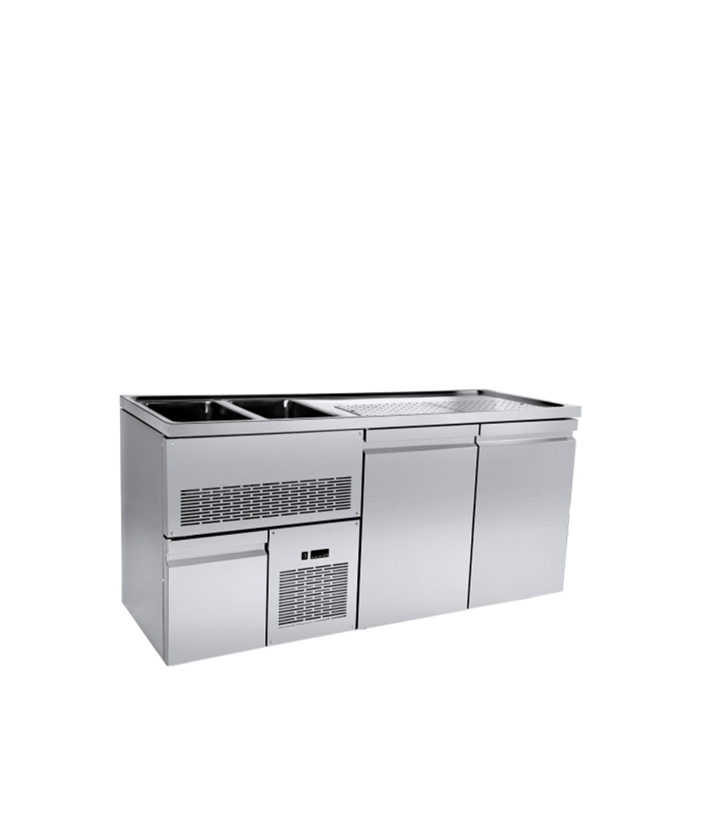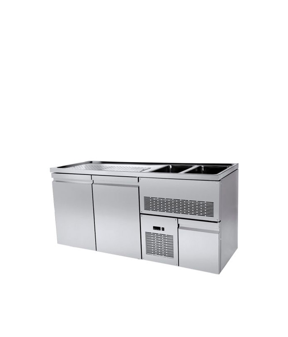 Το Ψυγείο Μπύρας με 2 + 1/2 Πόρτες & 2 Γούρνες – PA GE 195L2, του ελληνικού εργοστασίου Niki Inox, είναι ψηλός πάγκος συντήρησης μπύρας. Είναι το κατάλληλο ψυγείο πάγκος για συντήρηση μπύρας, χάρη στις δύο ψηλές πόρτες που διαθέτει με χώρο αποθήκευσης 2 x (44 x 55 x 80 cm). Έτσι, σας επιτρέπει να τοποθετήσετε τα βαρέλια μπύρας και να διατηρήσετε τη μπύρα σε θερμοκρασία από -1°C έως +8°C. Διαθέτει, επίσης μία μικρή πόρτα στη πλευρά που είναι το ψυκτικό μηχάνημα. Επίσης, διαθέτει 2 γούρνες, με διάσταση 2 x (30,5 x 50,5 x 30 cm) στην πλευρά που βρίσκεται το ψυκτικό μηχάνημα. Στην υπόλοιπη επιφάνεια εργασίας έχει τρύπες αποστράγγισης με διάσταση 97,8 x 27,8 cm (MxB). Διατίθεται είτε με γούρνες και ψυκτικό μηχάνημα αριστερά (κωδ. L2) είτε με γούρνες και ψυκτικό μηχάνημα δεξιά (κωδ. R2). Η ισχύς του ψυκτικού μηχανήματος είναι 1/4 Hp. Αυτό το ψυγείο πάγκος συντήρησης έχει βάθος 70 cm και είναι κατασκευασμένο από ανοξείδωτο χάλυβα (Inox 304). Διαθέτει μόνωση πολυουρεθάνης, κουμπωτά μαγνητικά λάστιχα και ηλεκτρονικό θερμοστάτη με δυνατότητα αυτόματης απόψυξης. Τα πόδια είναι ρυθμιζόμενα.